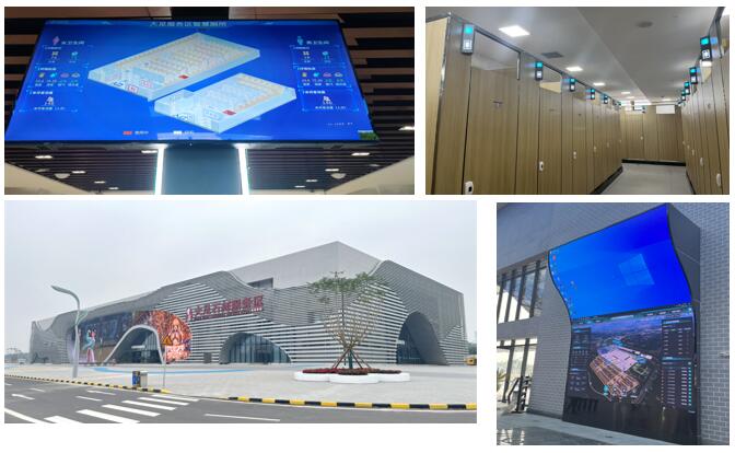在本次項目中,我公司提供智慧衛(wèi)生間導視系統、曲面小間距全彩屏、分流導視屏、門架情報板、多功能一體機等設備。